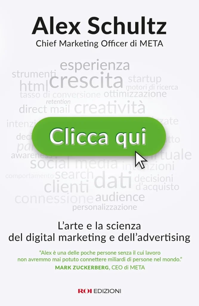Clicca qui non ti svela il Sacro Gral. Ne le strategie di Meta o come funziona il loro algoritmo. Ti porta all’interno di un metodo, quello di Schultz, che ha aiutato Facebook a crescere sempre più fino a diventare la piattaforma che conosciamo oggi, quella che muove miliardi di investimenti in adv online ogni giorno. Ti svela le prime campagne, i primi risultati, gli errori e i cambiamenti. Se hai iniziato in quegli anni, il 2010 in Italia più o meno, ti ci ritrovi molto in questa lettura. Nel nostro piccolo abbiamo iniziato tutti da piccole sponsorizzate, per poi scoprire pian piano nuove funzioni, testando cosa faceva per noi e cosa no. Muovendo budget più o meno grandi e portando online piccole aziende che fino ad allora investivano solo in media tradizionali (stampa o tv).